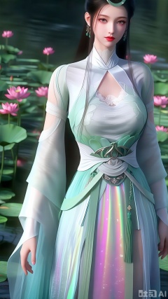 (masterpiece, best quality:1.2),1girl, navel, solo, midriff, bare shoulders, hair ornament,(long hair),(High double ponytail:1.49), red lips, BREAK, (looking at viewer:1.39), chinese clothes,(Holographic long dress:1.36), (lace,Rainbow Gradient Color:1.28), BREAK,blurry, solo focus, long hair, lips, daytime, lipstick, outdoors, standing,upper body,(huge breasts:2.89), background, solo, makeup,(huge breasts,full breasts:1.39),,(Background with lotus pond and pink lotus flowers:1.39),,XlujiajiaQw,XmupeulingHY3,XiPhone17Pro