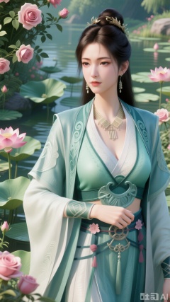 (masterpiece:1.2),best quality,,A woman adorned in traditional Chinese attire,featuring a flowing robe with intricate embroidery and floral accents. A garden filled with pink roses and lush greenery. Soft pastel hues of white,blue,and green,creating a serene atmosphere. Photorealistic photography.,(huge breasts,full breasts:1.39),,(Background with lotus pond and pink lotus flowers:1.39),,XlujiajiaQw,XmupeulingHY3,XiPhone17Pro