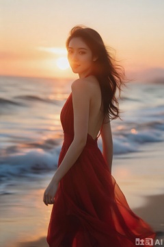 性感女性,她在海边日落时分漫步,身着飘逸的红色露背长裙,裙摆随海风飘动,风格是电影写真的浪漫氛围。橘红色的落日余晖从正面洒下,形成柔和的逆光效果,搭配柔光渲染,让人物周身笼罩一层金色光晕。色彩以落日红、海水蓝与沙滩金为主,冷暖交织极具美感,背景用动态模糊处理流动的海浪与晚霞,视角选用远景跟拍,展现人物与海边风光的融合,传递自由浪漫的感觉。,模糊动态背景