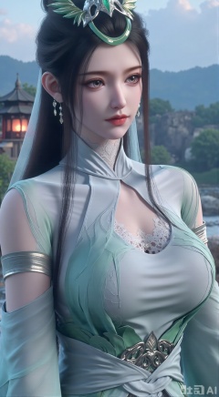 (masterpiece, best quality:1.2),1 girl, solo, long hair, black hair, hair accessories, clothing, cleavage cuts, long dress, jewelry, upper body, earrings. Background is outdoor, sky, clouds, water, trees, architecture, landscape, lantern, mountain, dragon, architecture, bridge, east Asian architecture, fog, pagoda,,(huge breasts:2.99),(full breasts:2.99),XyunxiaoYH3,,XbaifengsongyuYH,Xbigbreasts,Xxuenvxuedi,XyanqingfeiX,Xloubeidress,XyinyueX3,Xxihechengzhu,Xyunwangshuchengzhu,Xxinghuanwang01,XlujiajiaYH,Xxinghuanwang001