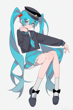 (artist: molu stranger),(artist: ccroquette:1.3), (artist: ASK:1.1), (artist: yoneyama ma i:0.8), (artist: INPLICK:0.7), artist: zhibuji loom,(artist: pottsness:0.5), artist: AU,1girl, solo, long hair, looking at viewer, bangs, blue eyes, skirt, simple background, shirt, hair ornament, long sleeves, hat, white background, dress, bow, hair between eyes, twintails, sitting, very long hair, closed mouth, blue hair, full body, shoes, black headwear, knees together feet apart, invisible chair, hatsune miku, yuki miku,Riko