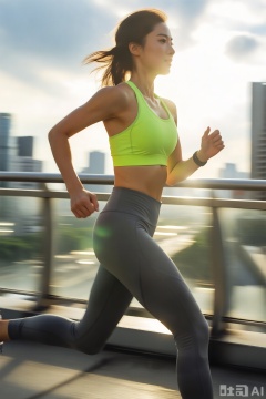 性感女性,身着荧光绿运动背心与灰色紧身运动裤,正在都市人行天桥上奔跑,双臂自然摆动,腿部肌肉线条紧实,展现出强劲的动感姿态,风格是电影写真的都市运动风。清晨的阳光透过云层洒下,形成柔和的侧逆光,在她身后勾勒出金色轮廓,搭配清新写实渲染,让汗水痕迹与运动面料质感真实可触,色彩以荧光绿与天空蓝、浅灰为主,贴合都市晨景,背景用动态模糊的天桥栏杆与远处的城市建筑群,采用跟拍视角,跟随女性奔跑轨迹,凸显都市清晨的活力与她的动感魅力。,模糊动态背景
