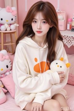 The image shows a person sitting on a bed, wearing a white hoodie with an orange face design on the front. The person has long, wavy brown hair and is holding a plush toy with a white body and orange ears. The background includes a pink bed with pillows, a lace-patterned tablecloth, and various plush toys and accessories, including a Hello Kitty figure and a small pink and white stuffed animal. The overall setting appears to be a cozy, playful room, possibly a child's bedroom or a personal space for someone who enjoys cute and whimsical items.