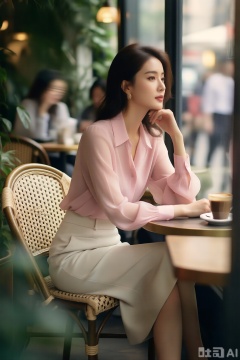 气质温婉的性感白领,穿着淡粉色的雪纺衬衫,搭配米白色高腰西装裙,在都市的花园咖啡馆里,坐在藤编椅上,一手托腮,眼神看向窗外,姿态轻柔又有知性美。风格贴合电影写真的都市休闲感,咖啡馆的自然光与室内暖光交融,形成柔和的漫射光,搭配细腻的渲染,让雪纺的轻盈质感尽显,色彩以淡粉、米白与咖啡馆内绿植的深绿为主,背景用动态模糊的咖啡馆内其他顾客与窗外街景,采用中景视角,展现女性在都市休闲时光中的优雅与性感,传递出都市生活的惬意。