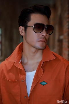 男性戴墨镜,穿橙色衬衫、内搭白色背心,身处昏暗带红砖元素的室内场景,风格复古有型。