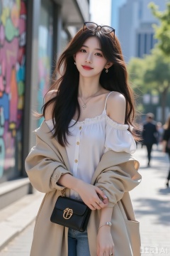 A young woman posing in a vibrant city street scene with colorful graffiti art on the walls and modern glass buildings in the background. The sunlight is bright and warm, casting soft shadows and highlights.There is a camera on her neck. She is standing full body, facing the camera with a confident and friendly smile. Her outfit is trendy and fashionable: a crisp white button-down blouse with subtle ruffles at the cuffs.she wears black leather ankle boots with a low heel. Over her shoulders, she has a light beige trench coat draped casually. Her accessories include a delicate silver chain necklace, a matching bracelet, and oversized sunglasses pushed up on her head. Her hair is long, dark, and wavy, flowing freely in a gentle breeze. She holds a small, structured black handbag with gold hardware. The overall look is polished and chic, perfect for a day out in the city. The atmosphere is lively yet relaxed, with a few pedestrians blurred in the distant background to add depth but no other people clearly visible. The shot is taken from a medium angle, capturing her entire figure and the stylish urban environment.