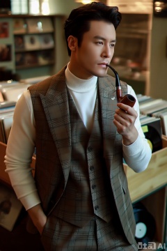 复古风型男,身着格纹西装马甲与白色高领毛衣,手持木质烟斗,眼神深邃望向远方,呈现电影写真的怀旧质感。暖黄色柔光从窗户渗入,在墙面投下斑驳光影,照亮人物轮廓,搭配Maya 渲染,让格纹纹理的细腻度与毛衣的柔软质感完美呈现。色彩以焦糖棕、墨绿与米白为主,营造复古氛围,背景是动态模糊的老式唱片店货架,黑胶唱片虚影增添年代感,采用中景俯视视角,构图沉稳,如同从电影中截取的复古画面。模糊动态背景