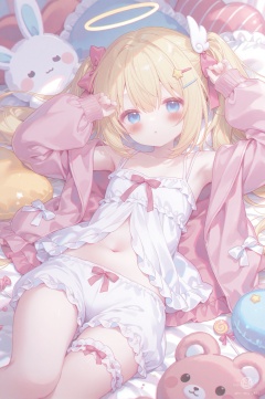masterpiece,very aware,highres,absurdres,newest,best quality,loli,petite,high quality,chromatic_aberration,cinematic_angle,dutch angle,//,umehara,1girl,blonde hair,blue eyes,solo,stuffed toy,white bloomers,stuffed animal,bloomers,twintails,pink jacket,parted lips,looking at viewer,jacket,halo,white camisole,puffy long sleeves,pillow,blush,long hair,babydoll,lying,on back,open clothes,navel,open jacket,stuffed cat,camisole,feet out of frame,long sleeves,frills,ribbon,collarbone,pink ribbon,sleeves past wrists,signature,hair ribbon,food,frilled shorts,very long hair,frilled pillow,puffy sleeves,:o,bow,underwear,hands up,star (symbol),bare shoulders,candy,bridal garter,teddy bear,heart-shaped pillow,pink bow,frilled camisole,lollipop,off shoulder,hair bow,bed sheet,short shorts,hair ornament,frilled jacket,virtual youtuber,heart,shorts,stuffed rabbit,hair between eyes,white shorts,dated,depth of field,breasts,blurry,armpits,white bow,hairclip,small breasts,wing hair ornament,midriff,on bed,dress,thigh strap,flat chest,arms up,hand up,