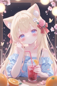 masterpiece,very aware,highres,absurdres,newest,best quality,loli,petite,high quality,chromatic_aberration,cinematic_angle,dutch angle,nyalia,//,umehara,//, 1girl, solo, blonde hair, flower, drinking straw, hair bow, bow, animal ears, parted lips, cup, blush, collarbone, looking at viewer, blue eyes, shirt, striped bow, long hair, bendy straw, off shoulder, drinking glass, blue shirt, hair flower, food, white flower, hair ornament, red bow, fruit, animal ear fluff, bare shoulders, blurry, rose, holding, red flower, upper body, depth of field, blurry foreground, pink flower, holding cup, off-shoulder shirt, drink, braid, blurry background, purple eyes, cat ears, hand up, branch, orange slice, hands up, lemon, butterfly, petals, red rose, cherry blossoms, orange (fruit), head tilt, bug, disposable cup