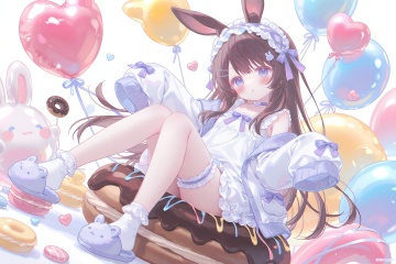masterpiece,very aware,highres,absurdres,newest,best quality,loli,petite,high quality,chromatic_aberration,cinematic_angle,dutch angle,//,umehara,1girl,balloon,animal ears,food,heart balloon,purple eyes,long hair,dress,doughnut,solo,bridal garter,white dress,macaron,slippers,rabbit ears,hair ornament,candy,full body,white socks,looking at viewer,socks,frilled socks,sleeves past fingers,lollipop,brown hair,hairclip,cupcake,sleeves past wrists,jacket,white footwear,sitting,animal slippers,choker,frills,knees together feet apart,blush,off shoulder,animal ear fluff,heart,purple bow,open clothes,bow,:o,white background,cardigan,rabbit girl,sleeveless dress,convenient leg,long sleeves,cloud,purple ribbon,open jacket,hair bow,parted lips,ribbon,frilled dress,white jacket,very long hair,sleeveless,hairband,collarbone,purple choker,rabbit,bare shoulders,lolita hairband,bobby socks,simple background,virtual youtuber,pastel,