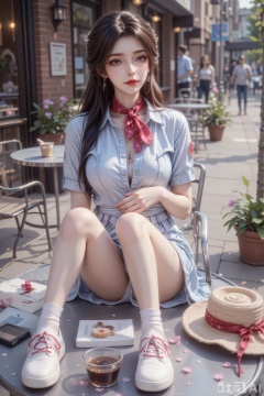 Her entire figure is bathed in warm afternoon sunlight, highlighting the details of her outfit and her relaxed seated posture. The background features a charming café patio: wrought iron tables and chairs, potted flowers on the edge, a brick building with large windows, and people walking by on the sidewalk. The air carries the scent of freshly brewed coffee and pastries. Sounds of clinking cups, distant chatter, and a street musician playing guitar create a lively atmosphere. Afternoon sunlight casts soft shadows around her full body, highlighting the gingham pattern and creating a cozy, inviting ambiance."