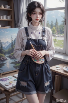"Super realistic and artistic illustrations, Half-body close-up framing from mid-torso to top of head, an artist in mountain studio attire, with jet black messy bob (short with choppy layers, side-swept bangs falling over one eye, hair slightly disheveled with paint splatters, ends angular and edgy). Wearing a charcoal gray linen smock (oversized with rolled-up sleeves, fabric loose and breathable, pockets filled with paintbrushes), a white cotton turtleneck (fitted with soft texture, neckline covering the chin, fabric slightly stained with watercolor), and dark indigo denim overalls (distressed with faded patches, straps adjusted loosely over the shoulders).