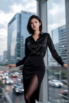 性感白领女性,身着黑色真丝衬衫与高腰开叉西装裙,黑丝,站在写字楼落地窗前轻倚窗框,姿态优雅干练。电影写真风格,冷调自然光勾勒身形,高清写实渲染凸显面料质感。背景以极强动态模糊处理楼下车流与云层,形成横向拉丝光影,色彩以沉黑与窗外城市的浅灰、天蓝为主,中景视角聚焦女性自信神情,背景虚化程度达80%,强化都市快节奏的流动感。