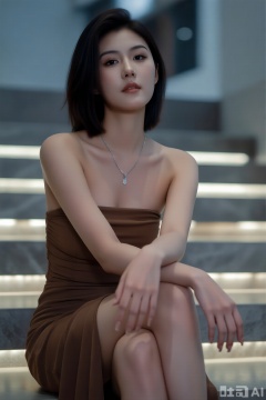一位年轻女性,穿着棕色抹胸连衣裙,佩戴银色项链,坐在带有灯光的室内场所,双臂交叉放在腿上,电影写真风格,冷调自然光勾勒身形,高清写实渲染凸显面料质感。