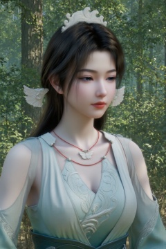 A highly detailed CGI image of a young Asian woman with fair skin and long, dark hair, adorned with white, ornate hair accessories. She wears a light blue, intricately patterned dress with a plunging neckline, revealing a red necklace with a butterfly pendant. The background is a lush, green forest., masterpiece,best_quality,ultra-detailed,soft lighting,ethereal atmosphere,delicate composition,natural textures,minimalist aesthetic,serene mood,polished photography,high-resolution clarity,harmonious tones,elegant posing,intimate ambiance,refined details,balanced framing,photorealistic rendering,soothing color palette.,, Negative prompt: ng_deepnegative_v1_75t,(badhandv4:1.2),EasyNegative,(worst quality:2),,nsfw, Steps: 30, Sampler: DPM++ 2M, CFG scale: 3.5, Seed: 3765053330, Size: 1024x1536, Model hash: 062dad72b2, Model: 麦橘超然majicFlus_v1.safetensors, Denoising strength: 0, RNG: CPU, Lora 1: 20250822-1755878391617-0013, Lora Hash 1: 4845efea02, Lora Weight 1: 1.0, vae_name: automatic