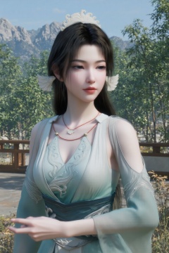 A highly detailed CGI rendering of a beautiful,fair-skinned woman with long,dark hair adorned with a white flower. She wears a flowing,light blue,sleeveless dress with intricate patterns and a white floral crown. The background features lush greenery and a mountainous landscape under a clear blue sky.,masterpiece,best_quality,ultra-detailed,soft lighting,ethereal atmosphere,delicate composition,natural textures,minimalist aesthetic,serene mood,polished photography,high-resolution clarity,harmonious tones,elegant posing,intimate ambiance,refined details,balanced framing,photorealistic rendering,soothing color palette.,