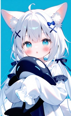 best,//,alens,1girl,animal ears,hair ornament,white hair,blue eyes,long hair,sleeves past fingers,sleeves past wrists,tail,bow,ahoge,looking at viewer,x hair ornament,twintails,low twintails,animal ear fluff,solo,blush,long sleeves,hair bow,fox ears,blue bow,:o,fox girl,upper body,shirt,white shirt,hugging object,blue background,fox tail,parted lips,chestnut mouth,open mouth,hair between eyes,>_<,dress,black bow,simple background,two-tone background,white background,very long hair,open clothes,white border,sidelocks,border,frilled sleeves,grey hair,aqua eyes,hairclip,hair intakes,frills,dot nose,stuffed toy,virtual youtuberarm garter,orca,