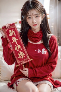 提示词1 个女孩,美女,五官精致秀丽甜美,黑色长发,穿红色毛衣,全身,坐在沙发上,红色围巾,新年喜庆氛围,手拿一个新年快乐的红色横幅上用书法写着“新年快乐”四个大字,正面照,微笑,丁达尔光影,细节描写细致,精美,写实摄影,32K,大师级构图,luoyu