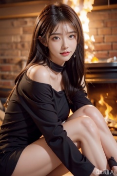 一位年轻女性,穿着黑色露肩上衣,坐在壁炉旁,双腿弯曲抱膝,背景是燃烧着火焰的壁炉和砖墙。,暖黄逆光勾勒轮廓,突出复古精致感。,模糊动态背景