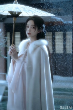 一名穿着白色披风的年轻亚洲妇女站在建筑物的背景前。女人的脸朝向镜头,,头发沿着她的右边飘逸。她拿着一把雨伞,雨伞被雪覆盖,而伞在框架的左侧铸造了一个阴影。背景是模糊的,暗示了一个宁静的下雪天