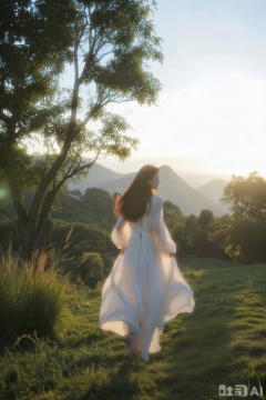 这是一张关于一位穿着飘逸白色连衣裙的女子在日落时分穿过田野的照片,前景是一棵树,远处是雾蒙蒙的山谷。画面还展示了一种宁静和平和的氛围。在画面的中间,一位留着棕色长发的女子,穿着白色连衣裙,似乎正从观众面前走开,背对着相机。她站在一片草地上,左边是高高的草和一颗树。女子脸上带着温柔的表情,她的长发披散在背后,连衣裙在风中飘动,她既没有穿鞋子也没有穿裤子。背景是清澈的蓝天和几座远处的山脉,画面具有柔和、超然的特点,温暖的金色光线透过树木过滤进来。