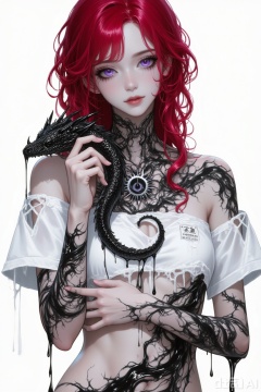 Masterpiece, best quality, ultra-detailed, sharp focus, stigma_art, 1girl, deep red long curly hair, eyes like shattered crystal, purple in color, with the other eye a pure, abyss-like black (heterochromia). She wears a tattered white patient gown ripped at the waist, exposing her shoulder and abdomen. Her smooth skin is covered in black patterns that resemble living tattoos; these patterns are not static but flow and expand beneath the skin like veins. She is lovingly caressing an incredibly small Eastern dragon, materialized from these living tattoos, its body jet-black with long black whiskers. The dragon's body is like flowing ink, slowly shifting its form in her arms, with viscous black liquid sliding off its body.