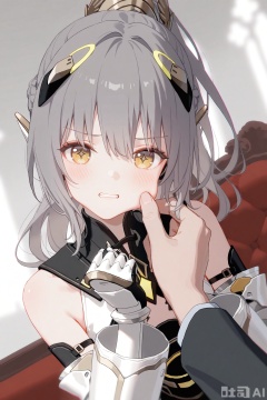 masterpiece,very aware,highres,absurdres,newest,best quality,loli,petite,high quality,chromatic_aberration,cinematic_angle,dutch angle,//,artist:ciloranko,artist:ningen_mame,artist:sho_(sho_lwlw),artist:rhasta,artist:wlop,artist:ke-ta,artist:hiten \(hitenkei\),//,nanami/punishing gray raven,1girl, solo, long hair, bangs, dress, bare shoulders, yellow eyes, ponytail, grey hair, armor, gauntlets,brown cross shaped pupils,cheek pinching, hands up, hair between eyes, pinching, solo focus,