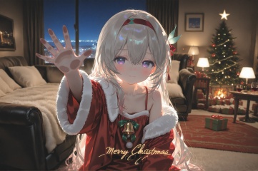 nyalia,loli,loli,loli,1girl,christmas,merry christmas,gift,long hair,hairband,solo,box,lamp,christmas tree,gift box,looking at viewer,indoors,santa costume,window,cup,blue eyes,smile,drinking glass,glass,night,dress,closed mouth,blush,hair between eyes,christmas present,grey hair,carpet,fur trim,condensation,long sleeves,hair ornament,bare shoulders,curtains,blurry,table,red dress,sitting,red hairband,sidelocks,ribbon,off shoulder,blonde hair,city lights,upper body,collarbone,desk lamp,rug,arm up,bell,night sky,christmas ornaments,against glass,depth of field,bed,jacket,santa dress,spaghetti strap,drink,purple eyes,fireplace,bedroom,fur-trimmed jacket,ice,santa hat,cityscape,fur-trimmed sleeves,english text,sky,alcohol,white hair,reaching,skyline,red jacket,armchair,hat,wine glass,hair ribbon,open clothes,red ribbon,blurry background,bow,light smile,pillow,headband,city,wide sleeves,reaching towards viewer,<lora:nyalia acid4up-000023:0.8>,
