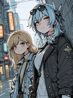 (masterpiece), (best quality), ultra-detailed, cinematic lighting, upper body, 2girls together, modern urban sketch style, street fashion, city mood, dynamic duo pose,(Eula and Amber from Genshin Impact), 2girls leaning side by side against a graffiti-covered wall, casual and stylish, relaxed urban vibe, natural chemistry,Eula:bored expression, sunglasses on head, loose turtleneck sweater, windswept hair,Amber:cheerful smile, short jacket over t-shirt, casual jewelry, crossbody bag, earrings,(dynamic angle), candid street shot, asymmetrical framing, reflective puddles below, (rain-damp street texture:0.8), light lens flare, (film grain:0.6), soft ambient breeze moving their hair,urban grunge background, colored neon light leaks, sketch texture, ink shading lines, (low saturation palette:0.5), moody overcast sky, soft directional light hitting one side of their faces, quiet melancholy energy, subtle motion blur, natural body posture, moment of calm in a busy street,lazypos