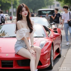 A young woman is sitting on a Ferrari sports car on the roadside. She was wearing off the shoulder and crop tops, super shorts,light colored pan, and white sneakers. Necklace, watch, earrings, jade bracelet, ankle chain, her skin is fair and delicate, with a white luster. Her waist circumference is very thin, and her long hair is brown, outlining her face. Beautiful hair, tied in a ponytail, and rose colored lips. Pink nails, full body, facing the audience, low angle shooting. Background: University town, students passing by, a Rolls Royce Phantom parked on the roadside, a real photo, a drop of water, a girl, of the best quality, a masterpiece, a beautiful woman