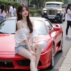 A young woman is sitting on a Ferrari sports car on the roadside. She was wearing off the shoulder and crop tops, super shorts,light colored pan, and white sneakers. Necklace, watch, earrings, jade bracelet, ankle chain, her skin is fair and delicate, with a white luster. Her waist circumference is very thin, and her long hair is brown, outlining her face. Beautiful hair, tied in a ponytail, and rose colored lips. Pink nails, full body, facing the audience, low angle shooting. Background: University town, students passing by, a Rolls Royce Phantom parked on the roadside, a real photo, a drop of water, a girl, of the best quality, a masterpiece, a beautiful woman
