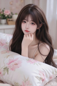 The image depicts a person with long, flowing hair. The pillow has a floral design with soft pastel colors, including pink and white. The person's eyes are visible, looking directly at the camera. The background is blurred, giving a dreamy, ethereal effect. The overall tone of the image is soft and serene, with a focus on the delicate textures of the hair and the pillow.