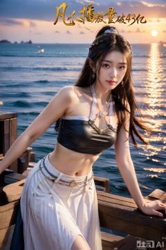 surreal warm cinematic full body shot photography, Kodak Professional Portra 160, 1girl,looking_at_viewer,navel,, ,realistic,,pose for picture,Dynamic posture, ,良好解剖结构,真人肌肤纹理, 4K画质,完美身材, best quality, masterpiece, realistic,cowboy_shot,(Good structure), DSLR Quality,Depth of field,kind smile,looking_at_viewer,Dynamic pose, 1girl, solo, long hair, , looking at viewer, skirt, hair ornament, bare shoulders, jewelry, , , earrings, outdoors, midriff, water, necklace, lips, crop top, grey eyes, leaning forward, ocean, white skirt, strapless vest, sunset, sun,