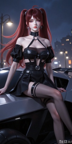 The image depicts a character sitting on a sleek, futuristic vehicle. The character has long, flowing red hair styled in pigtails, and is wearing a black outfit that includes a top with short puffed sleeves, a high-waisted skirt, and stockings with garters. The background features a cityscape at night, with illuminated buildings and streetlights casting a soft glow. The overall atmosphere is dark and atmospheric, with a focus on the character and the vehicle.