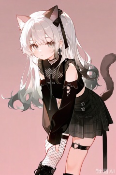 1girl, animal ears, black boots, black shirt, black skirt, boots, cat ears, cat girl, cat tail, cross, cross earrings, detached sleeves, earrings, expressionless, fishnets, gradient hair, grey eyes, grey hair, hand on own knee, jewelry, leaning forward, long hair, long sleeves, looking at viewer, miniskirt, multicolored hair, one side up, over-kneehighs, plaid clothes, plaid skirt, pleated skirt, shirt, simple background, single over-kneehigh, single thighhigh, skirt, tail, thigh strap, thighhighs, torn clothes, white background, white hair