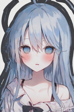 1girl, touwa erio, solo, blue eyes, long blue hair, blush, looking at viewer, white shirt, simple white background, bow, exposed collarbone, upper body, parted lips, hair between eyes, off-shoulder, ahoge
