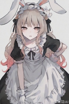 Simple Flat Coloring,sketch,line,simple background,white background,Hoshimi Miyabi,1girl,solo,Character front,maid costumes,gloves,wake,ornament,looking at viewer,black dress,White apron,simple background,rabbit,solo,white gloves,parted lips,collarbone,standing,leaning forward,face detail,masterpiece,best quality,absurdres,very aesthetic,collarbone,mole_under_eye,masterpiece,best quality,amazing quality,very aesthetic,absurdres,newest,gradient hair,