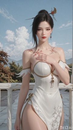 1girl, solo, covering cleavage, exquisite skin, cowboy_shot, looking at viewer, even illumination, very awa, Solid Glossy and cloud background,