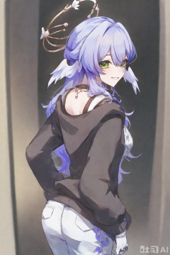 ,masterpiece,facing the lens,best quality,very aesthetic,extremely delicate and beautiful,huge filesize,amazing quality,32K UHD,fashionable,cool and fashionable,(Robin \(honkai: star rail\):1.2),1girl,solo,green eyes,(head wings:1.7),white_gloves,halo,green_eyes,jewelry,smile,looking_back,light,blue hair,purple hair,mid_shot,full_shot,loungewear,pants,sweater,