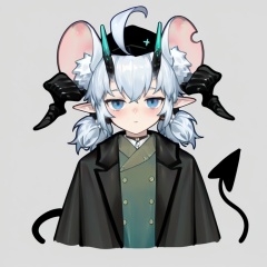 masterpiece, best quality,solo,(grey background:1.2),simple background,1girl,looking at viewer,black hat,  dajiaoshu_style,DK_zhengzheng_style,shuangweihuixing,mouse girl,rat ears,horns,blue eyes,pointy ears,ahoge,white hair,2 tails,animal ear fluff,demon tail,demon horns,short hair,twintails,<lora:双尾彗星-3.0-Ill20p:0.8>