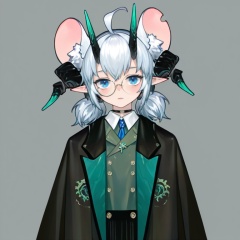masterpiece, best quality,solo,(grey background:1.2),simple background,1girl,looking at viewer, monocle,glasses,round eyewear, dajiaoshu_style,DK_zhengzheng_style,shuangweihuixing,mouse girl,rat ears,horns,blue eyes,pointy ears,ahoge,white hair,2 tails,animal ear fluff,demon tail,demon horns,short hair,twintails,<lora:双尾彗星-3.0-Ill20:0.8>