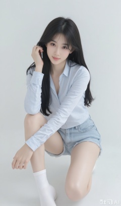 This is a high-resolution photo of an East Asian woman in her early twenties with fair skin and straight black hair cascading over her shoulders. She is squatting on the floor in a casual and relaxed pose, with her right knee bent and her left leg tucked beneath her. She is wearing a light blue and white striped long-sleeved shirt and matching shorts, revealing her slender legs. She has a small build and is wearing ankle-length white socks. Her expression is neutral, with a hint of a smile, and she is looking directly at the camera