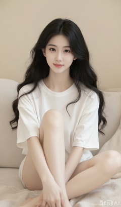girl,This is a photo of a young Asian woman. Her skin is fair and delicate, and her long black curly hair cascades over her shoulders. She sits on a soft off-white sofa, with a plain light beige wall as the background, creating a warm and cozy indoor atmosphere. The woman appears to be in her early twenties, with a slender figure. She is wearing a simple and loose white T-shirt, seemingly bare-legged, exuding a relaxed and casual vibe. Her expression is calm, with a faint smile on her lips. Her almond-shaped big eyes look straight into the camera, and her light makeup enhances the contours of her eyes. She has a small and delicate nose, full lips slightly parted, and wears natural pink lipstick. Crossing her legs adds a touch of modern youthfulness to her overall look. In the background, the sofa she sits on is covered with a soft light-colored fabric, possibly a blanket or throw. The aesthetic of the entire photo is soft and intimate, focusing on the serene and natural beauty of the subject.