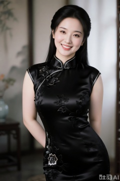 真人写真,古风,一位绝色美人,成熟大方,微笑直视镜头,微胖,美人白梦妍,玉骨冰肌,眼睛宛若秋水一般,清澈、明亮,肌肤胜雪,黑发,绝美的容貌,完美的身材全身,高挑的身材,紧身亮黑色绣花旗袍,室内背景,朦胧美,完美构图,高清质量,32K