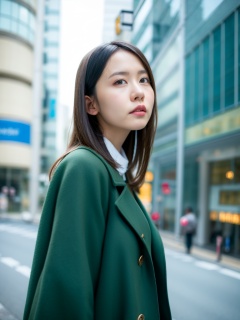 1girl, realistic, photorealistic, outdoors, black hair, solo, long hair, coat, lips, asian, day, blurry, street, green coat, black eyes, blurry background, city, real world location, looking at viewer, sleeves past wrists, sky, building, car, tokyo \(city\), nose, long sleeves, road, sweater