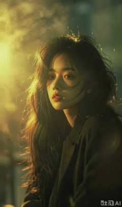 朦胧空气感,对焦模糊,胶片摄影,黄色强侧光,高曝,过曝,暗调,强对比,高反差,长发的前卫女生,碎发丝飘起,颓废,慵懒,梦核,肌理质感,情绪氛围感拉满,透视视角,胶片质感,慢快门,朦胧美学,氛围光,层次感