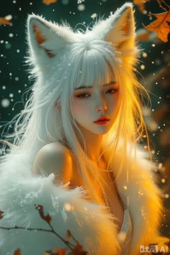 墨绿橙黄配色,白色长发齐刘海,高饱和对比,非常规独特构图,大师光影,印象派,朦胧,抽象艺术,奇幻,艺术氛围浓厚,斑驳的光影倾泻而下,露肩,穿过稀疏的枯叶,透过密集的灰尘,洒在脸上,视觉艺术,获奖作品,超广角镜头,长发如瀑散落,几缕发丝凌乱缠绕。美人,白色狐裘,狐狸耳朵,雾凇。C4D呈现裘毛细雪结晶冰霜光泽。