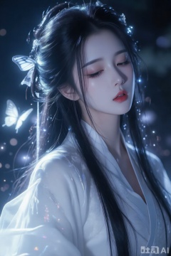 精致妆容、白色古风衣、蝴蝶古风美背景庭院、夜光、柔焦、华丽光影、高雅气质插画、柔和灯光、超清高细节、仙气、唯美造型(发丝蓬松细腻刻画)、高清特写、长睫毛、嘴微张、极致超清细节、光影交错对比斑斓气质、超高清画质、细节丰富精致感强背景简约、人物特写、高冷半眯眼、迷离滤镜。