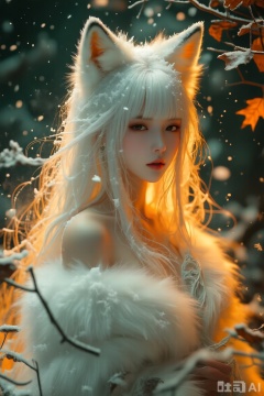 墨绿橙黄配色,白色长发齐刘海,高饱和对比,非常规独特构图,大师光影,印象派,朦胧,抽象艺术,奇幻,艺术氛围浓厚,斑驳的光影倾泻而下,露肩,穿过稀疏的枯叶,透过密集的灰尘,洒在脸上,视觉艺术,获奖作品,超广角镜头,长发如瀑散落,几缕发丝凌乱缠绕。美人,白色狐裘,狐狸耳朵,雾凇。C4D呈现裘毛细雪结晶冰霜光泽。