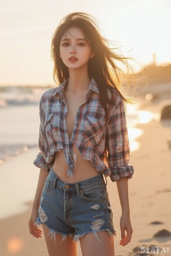 一个美女站在沙滩,穿着破损的格子衬衫,牛仔短裤,长发